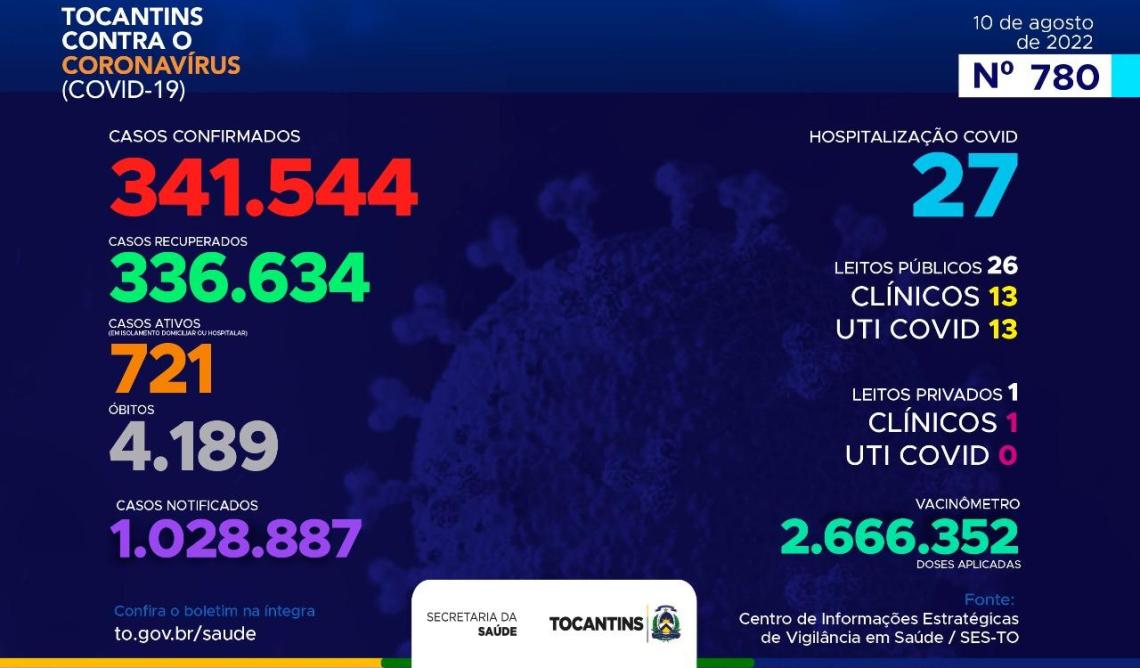 Atualmente, o Tocantins contabiliza 1.028.887 pessoas notificadas com a Covid-19 e acumula 341.544 casos confirmados. Destes 336.634 estão recuperados, 721 pacientes seguem em isolamento domiciliar ou hospitalar e 4.189 foram a óbito.
