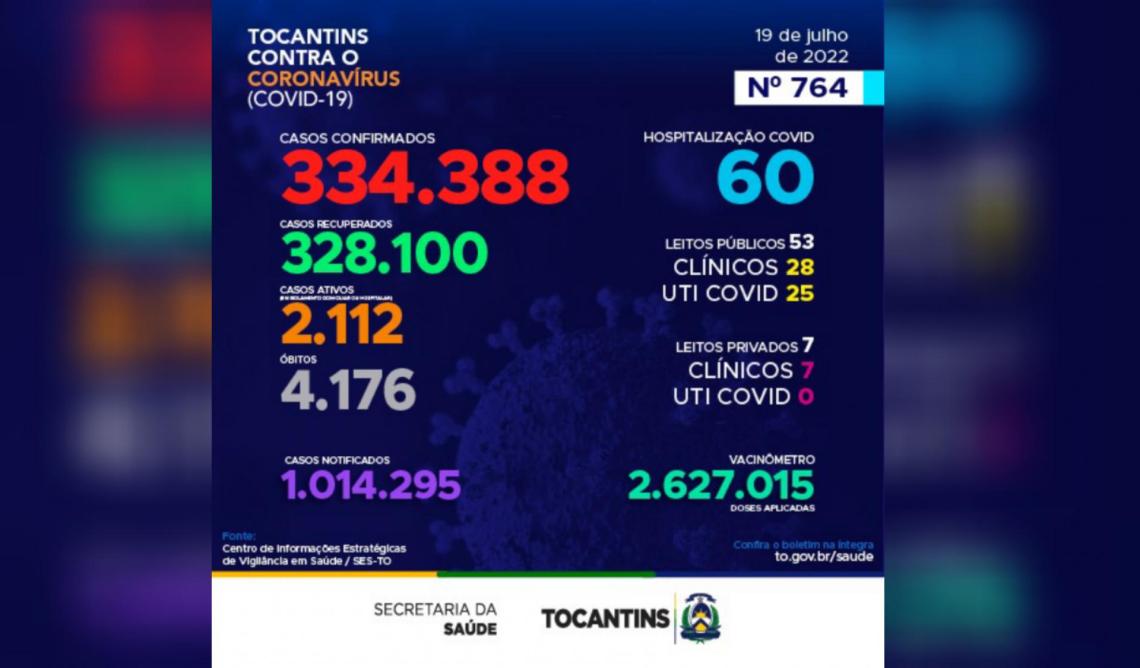 Atualmente, o Tocantins contabiliza 1.014.295 pessoas notificadas com a Covid-19 e acumula 334.388 casos confirmados. Destes 328.100 estão recuperados, 2.112 pacientes seguem em isolamento domiciliar ou hospitalar e 4.176 foram a óbito.