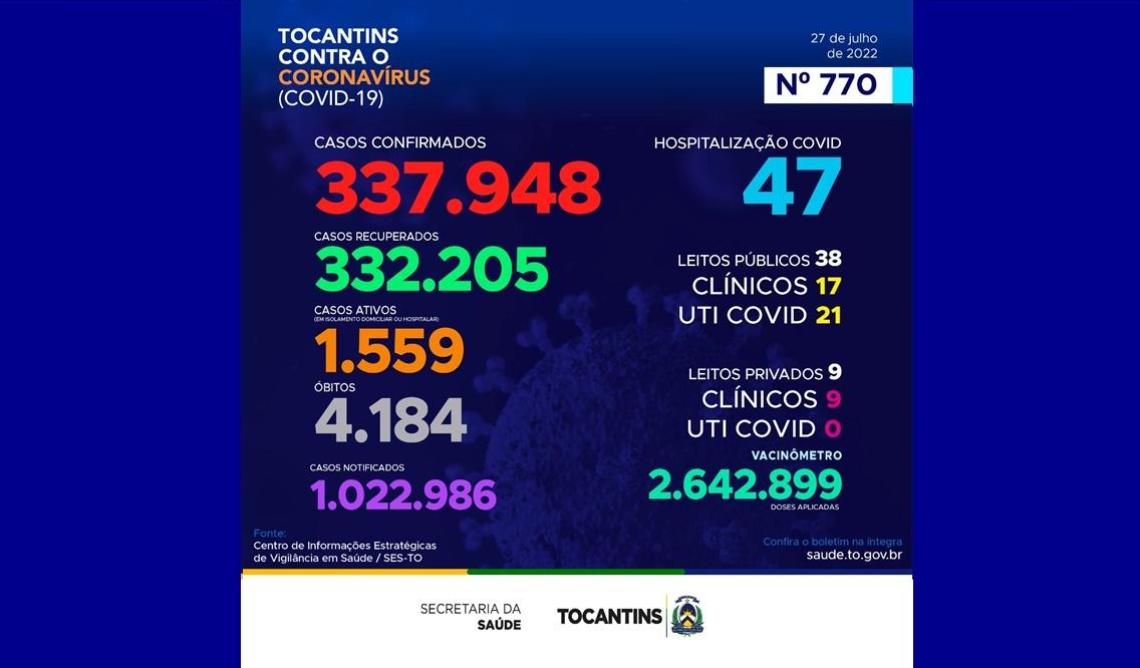 Atualmente, o Tocantins contabiliza 1.022.986 pessoas notificadas com a Covid-19 e acumula 337.948 casos confirmados. Destes 332.205 estão recuperados, 1.559 pacientes seguem em isolamento domiciliar ou hospitalar e 4.184 foram a óbito.