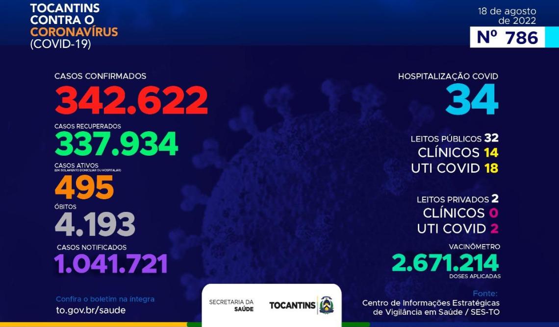 Atualmente, o Tocantins contabiliza 1.041.721 pessoas notificadas com a Covid-19 e acumula 342.622 casos confirmados. Destes 337.934 estão recuperados, 495 pacientes seguem em isolamento domiciliar ou hospitalar e 4.193 foram a óbito.