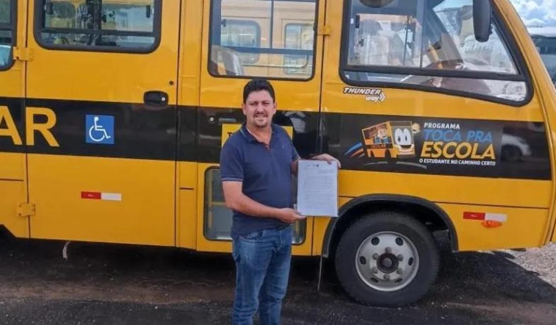 Prefeito de Barrolândia Adriano Ribeiro Posa ao lado do ônibus adquirido com recursos destinaos pelo Deputado Carlos Gaguim