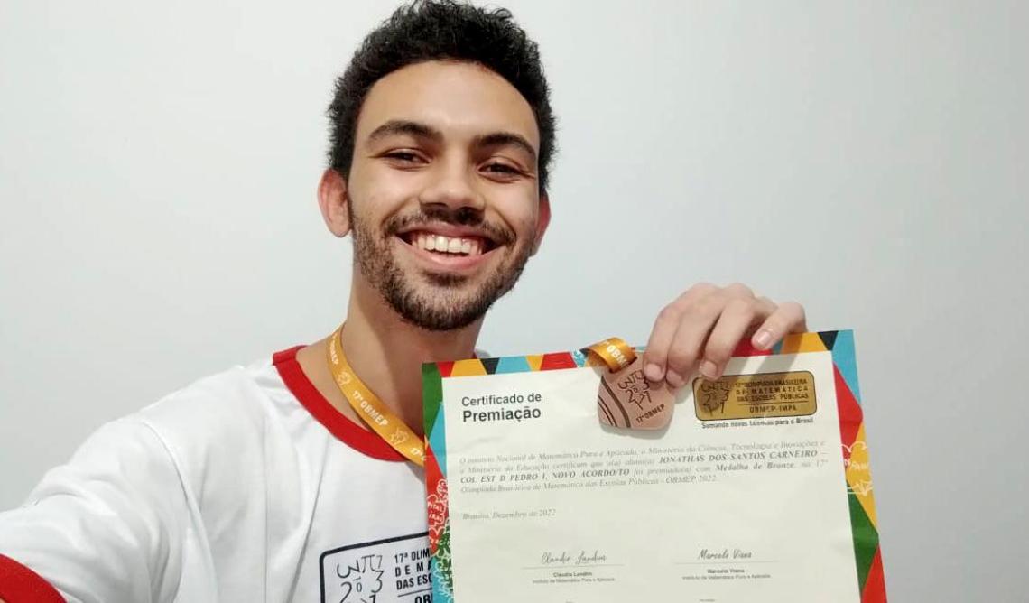 Mais um estudante da rede estadual de ensino do Tocantins alcançou destaque. Jonathas dos Santos Carneiro, 19 anos, que concluiu o ensino médio no Colégio Estadual Professora Eliacena Moura Leitão, de Novo Acordo, recebeu medalha de bronze, conquistada na 17ª edição da Olimpíada Brasileira de Matemática das Escolas Públicas (Obmep).