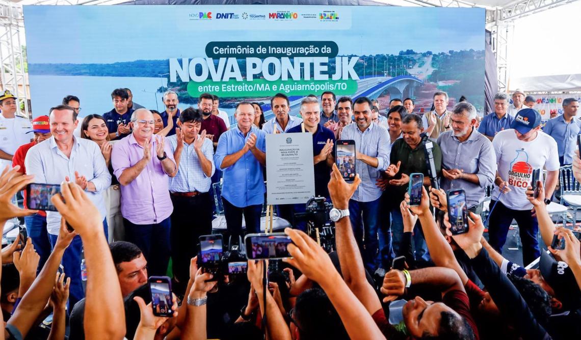 A população das Regiões Norte e Nordeste do país passa a contar novamente com uma ligação essencial para a mobilidade e o transporte de pessoas e de cargas. Nesta segunda-feira, 22, os governadores do Tocantins, Wanderlei Barbosa, do Maranhão, Carlos Brandão, e o ministro dos Transportes, Renan Filho, inauguraram a nova ponte Juscelino Kubitschek de Oliveira, sobre o Rio Tocantins, que conecta os municípios de Aguiarnópolis/TO e Estreito/MA pela rodovia BR-226. A entrega da obra foi simbolizada pelo descerramento da placa inaugural e pelo corte da fita, nas duas cabeceiras da estrutura, contando com a presença de autoridades federais, estaduais e municipais e da comunidade em geral.