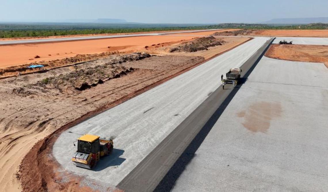 A obra iniciou em fevereiro deste ano e já foram realizados os serviços de nivelamento do terreno; preparação do solo e das camadas da pista, além das demais áreas que receberão pavimentação; construção da base do hangar – espaço destinado ao abrigo de aeronaves –, e a instalação do Sistema de Proteção contra Descargas Atmosféricas (SPDA); também foram feitas as fundações do terminal de passageiros, pilares, vigas, paredes, parte das instalações hidráulicas e parte das instalações sanitárias.