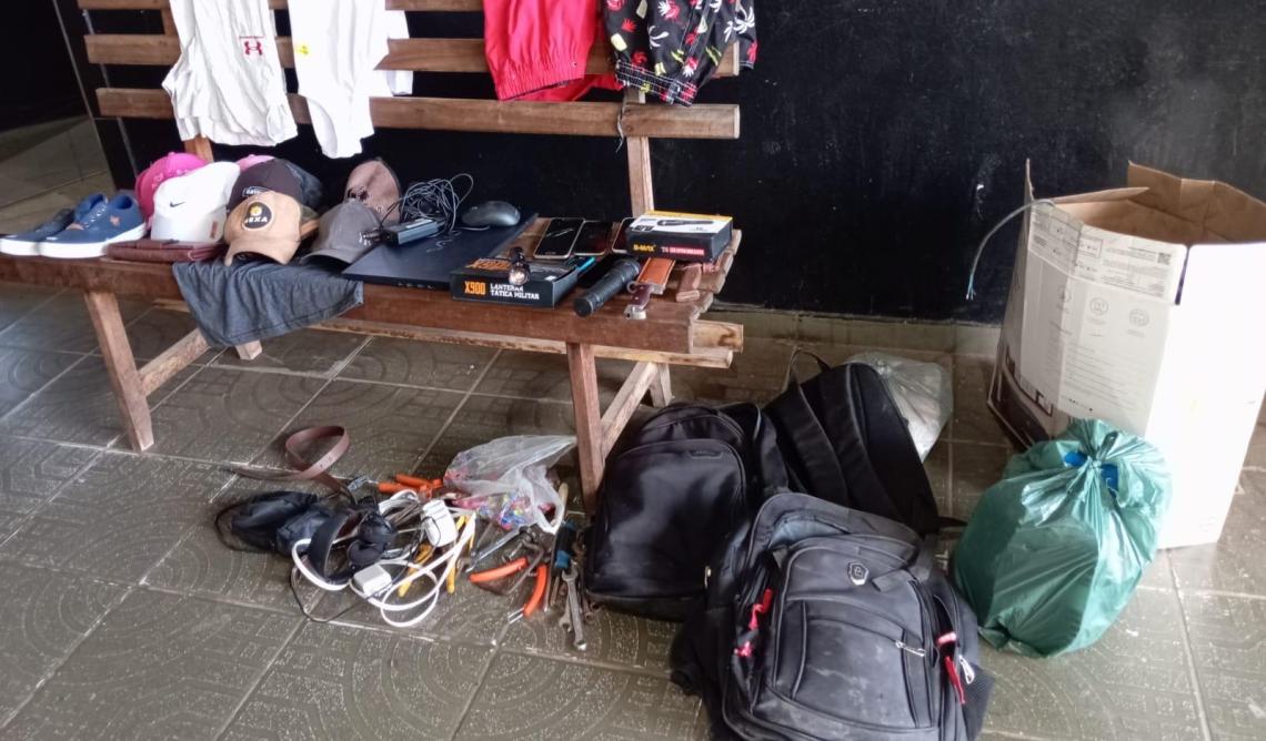No local, os policiais localizaram o suspeito e realizou a abordagem. Com o homem, foram encontrados diversos itens de procedência duvidosa, entre eles aparelhos celulares, peças de vestuário com etiquetas, um notebook pertencente ao patrimônio público estadual, equipamentos eletrônicos, ferramentas possivelmente utilizadas em arrombamentos, além de outros objetos variados. O homem não apresentou comprovação de origem dos materiais.