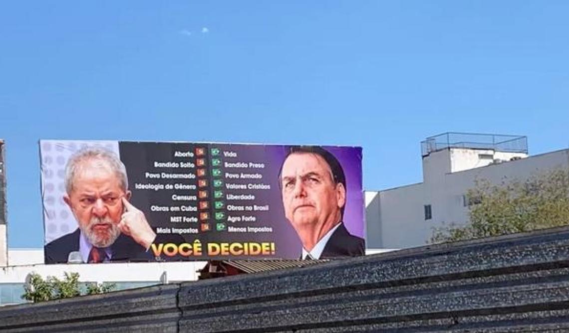 Decisão dá prazo de 24 horas para retirar anúncio instalado em dois pontos na capital. Painel atribui 'aborto, censura e MST forte' a Lula. Enquanto Bolsonaro é relacionado a palavras como 'vida, liberdade e agro forte'.