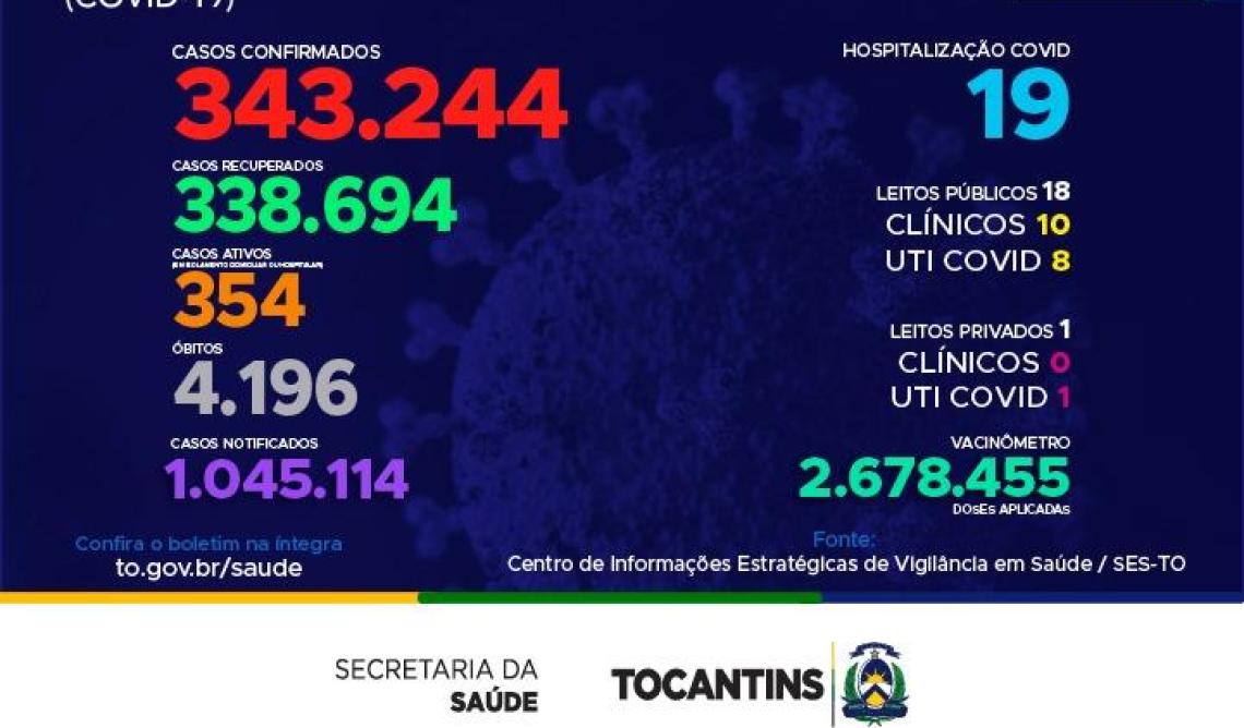 Atualmente, o Tocantins contabiliza 1.045.114 pessoas notificadas com a Covid-19 e acumula 343.244 casos confirmados. Destes 338.694 estão recuperados, 354 pacientes seguem em isolamento domiciliar ou hospitalar e 4.196 foram a óbito.