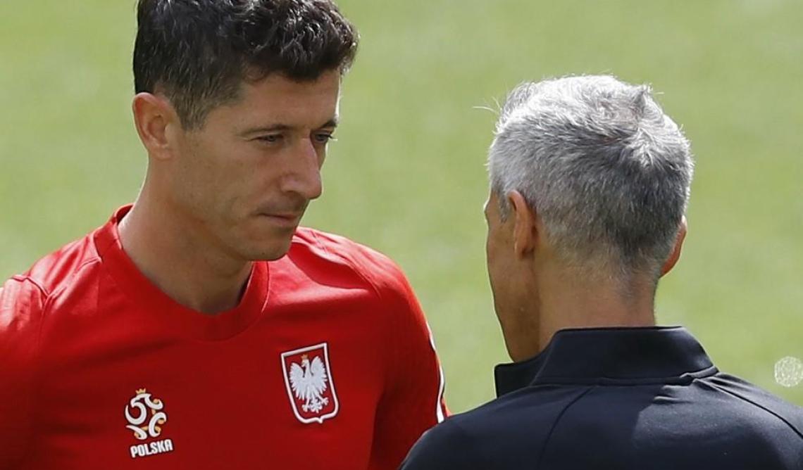 O artilheiro Lewandowski conversa com o técnico Paulo Sousa na véspera da estreia da Polônia na Euro — Foto: Kacper Pempel/Reuters