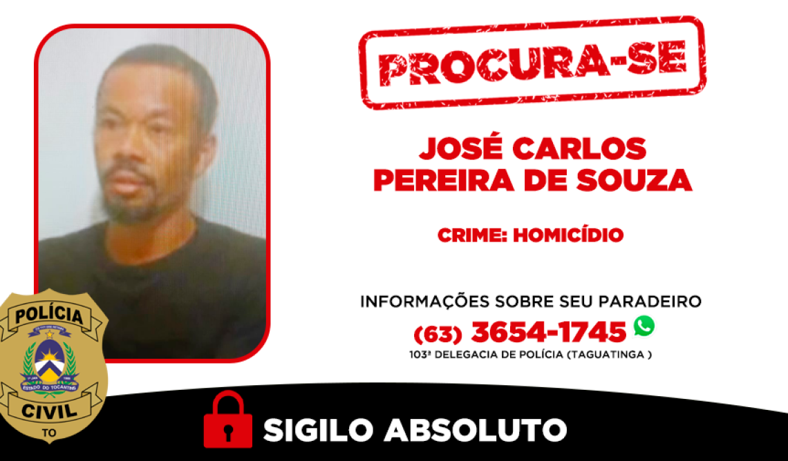 A Polícia Civil do Tocantins está à procura de José Carlos Pereira de Souza, de 39 anos, suspeito de envolvimento em um crime de homicídio que vitimou Gildomar da Silva Oliveira, de 37 anos, ocorrido em Taguatinga, região sudeste do Estado. O homem está com prisão preventiva decretada pela Justiça e, até o momento, segue foragido.