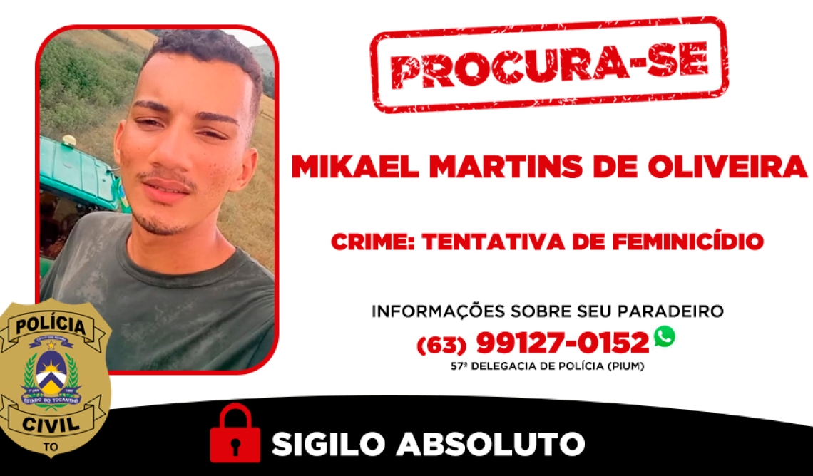 A Polícia Civil do Tocantins está à procura de Mikael Martins de Oliveira, investigado por tentativa de feminicídio contra sua companheira, na cidade de Pium.