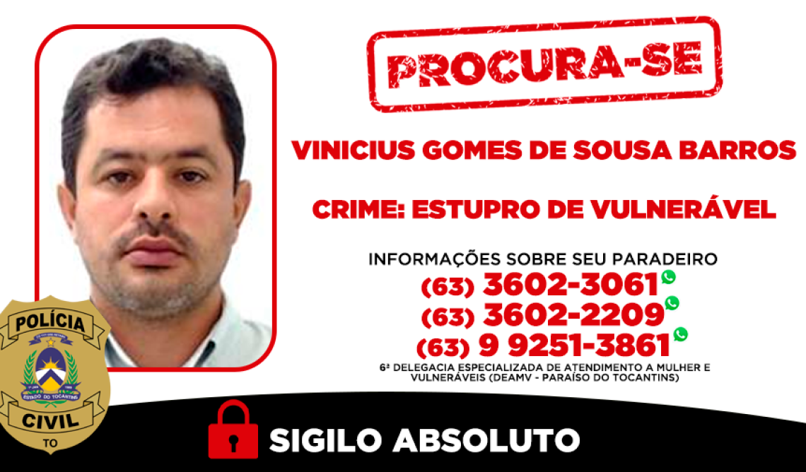 A Polícia Civil do Tocantins, por meio da 6ª Delegacia Especializada de Atendimento a Mulher e Vulneráveis de Paraíso do Tocantins (6ª DEAMV), procura Vinicius Gomes de Sousa Barros, de 38 anos, condenado a 8 anos, 10 meses e dias de reclusão pelo crime de estupro de vulnerável, ocorrido no dia 23 de março de 2017, em Paraíso do Tocantins.