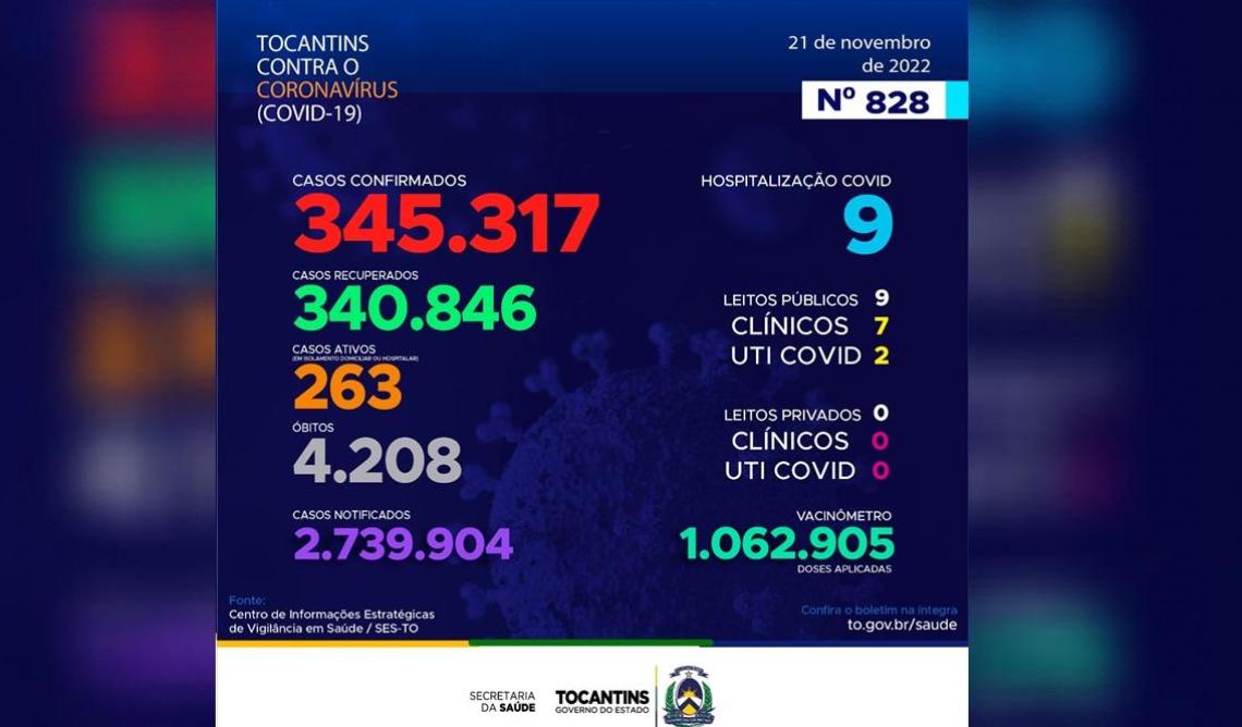 Atualmente, o Tocantins contabiliza 1.062.905 pessoas notificadas com a Covid-19 acumula 345.317 casos confirmados. Destes 340.846 estão recuperados, 263 pacientes seguem em isolamento domiciliar ou hospitalar e 4.208 foram a óbito.